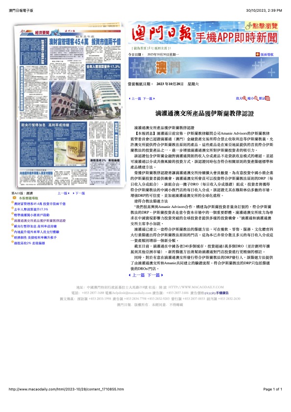 澳门日报|滴灌通澳交所产品获伊斯兰教律认证